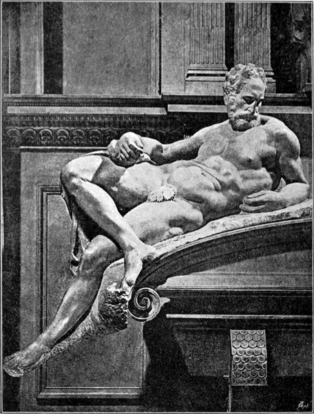 Dieser berühmte Austausch von Gedichten fand zu einer Zeit statt, wo für Florenz der Verlust der Freiheit eine endgültige Thatsache geworden war. Es wäre unrichtig darum anzunehmen, daß Michelangelo eine politische Anspielung im Sinne gehabt hätte, als er die Nacht so schmerzerfüllt darstellte. — Das Gegenbild der Nacht, der Tag, muß die zuletzt ausgeführte Figur sein; denn der Kopf derselben ist nicht über die erste Anlage hinausgekommen; aber aus den kaum angedeuteten Zügen dieses Kopfes spricht schon mit wunderbarer Bestimmtheit der beabsichtigte Ausdruck. Die gewaltige Kraft des Riesenleibes möchte sich zu Thaten regen, aber bittere Unlust hält ihn nieder, daß die mächtigen Glieder sich zu unerwünschter Ruhe bequemen müssen. — Die gleiche Bedeutung, wie an dem Grabmal Giulianos die Nacht und der Tag, haben um denjenigen Lorenzos der Abend (il crepuscolo, das Dunkelwerden) und der Morgen (l’aurora, die Morgenröte). Der Abend erscheint als ein Greis. Aber die Muskeln dieses Greises sind kaum weniger gewaltig, als diejenigen des kraftstrotzenden Mannes, der den Tag verbildlicht. Man sieht, es ist nicht körperliche Ermattung, sondern die Abspannung dumpfen Grams, was ihn schwer und müde zur Ruhe sinken läßt. Die Morgenröte zeigt im Gegensatz zur Nacht mädchenhafte Formen; sie ist schön, aber durch keinen Hauch von sinnlichem Reiz wird die Schönheit dieser Gestalt zum Menschlichen erniedrigt. Sie vermag nicht, sich vom Lager zu erheben; die Augen, die sich eben im Erwachen geöffnet haben, möchten sich gleich wieder schließen. In diesem Antlitz hat der Ausdruck des Schmerzes die größte Bitterkeit angenommen. Die Figur der Morgenröte wurde im Jahre 1531 fertig, man darf wohl denken, daß Michelangelo unwillkürlich in ihren Zügen sich die bitteren Empfindungen hat wiederspiegeln lassen, die der Fall von Florenz ihm verursachte. Es ist gar keine Frage, daß die Gestalten von Nacht und Morgen, Tag und Abend nichts anderes ausdrücken sollen, als den Schmerz über den Tod der beiden Mediceer. Was sie aber in Wirklichkeit ausdrücken, sind doch nur die Schmerzen, welche die Seele ihres Schöpfers marterten. Durch nichts unterscheiden sich Michelangelos Gestalten so sehr von der Antike, wie dadurch, daß sie gar nichts Allgemeingültiges haben, sondern nur die Äußerung rein per[S. 81]sönlicher Stimmung sind. Aber die Persönlichkeit, deren Seele so aus den Kunstwerken zu uns spricht, ist von einer überwältigenden, man möchte sagen übermenschlichen Größe.