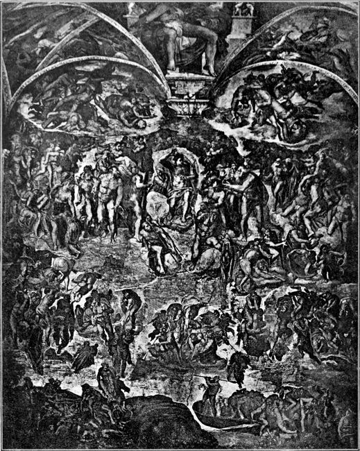 Alsbald wurden in der Sixtinischen Kapelle die Gerüste aufgeschlagen, und im Frühjahr 1535 begann Michelangelo die Ausführung des großen Freskogemäldes, dem, da es sich über die ganze Fläche der Altarwand ausdehnte, nicht nur die drei hier befindlichen Gemälde aus dem vorhergegangenen Jahrhundert (von Perugino), sondern auch zwei Lünettenbilder weichen mußten, welche Michelangelo selbst vor vierundzwanzig Jahren gemalt hatte. Am 1. September 1535 ernannte Paul III den Meister durch ein in den schmeichelhaftesten Ausdrücken abgefaßtes Breve zum obersten Baukünstler, Bildhauer und Maler des Vatikans und wies ihm auf Lebenszeit ein jährliches Einkommen von 600 Goldscudi und außerdem die Einkünfte aus dem Zoll der Pobrücke bei Piacenza, die auf den gleichen Betrag geschätzt wurden, an. — Der greise Meister gebrauchte acht Jahre, um das ungeheuer große Gemälde des Jüngsten Gerichts, bei dem er wieder jede Mitwirkung von Gehilfen verschmähte, zu vollenden. Der Weihnachtstag des Jahres 1541 wird als der Tag bezeichnet, an dem das Bild „zum Staunen Roms und der Welt“ aufgedeckt wurde.