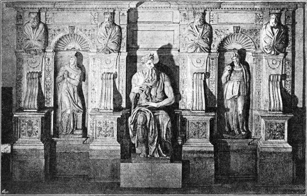So begann er eigenhändig, da doch einmal drei Figuren von seiner Hand das Werk schmücken sollten, die überlebensgroßen Figuren der Rachel und der Lea: jene als die Beschauliche betend, diese — nach einem von Dante gebrauchten Bilde — mit einem Blumenkranz in der Rechten und einem Spiegel in der Linken als die Thätige. Zwar wurde in dem Vertrag, der am 20. August 1542 als der letzte über das Juliusgrabmal abgeschlossen wurde, dem Meister gestattet, die Vollendung auch dieser beiden Figuren fremder Hand zu überlassen. Aber er kam später doch wieder auf die eigenhändige Ausarbeitung derselben zurück. Im Jahre 1545 war das Grabmal Julius’ II in der Gestalt, in der wir es in der Kirche S. Pietro in vincoli erblicken, fertig. Sein unterer Teil zeigt eine Anordnung, welche derjenigen entspricht, die Michelangelo für das Erdgeschoß des ursprünglich geplanten Grabbaues entworfen hatte: zu den Seiten eines Mittelfeldes zwei von Hermenpfeilern eingeschlossene Nischen. In den Nischen haben die Verbildlichungen des beschaulichen und des thätigen Lebens Platz gefunden, und in dem engen Mittelraum sitzt der gewaltige Moses; die Leere über den vor den Pfeilern heraustretenden Sockeln, die als Fußgestelle für die Reihe der Gefangenen gedacht waren, wird durch gewundene Steingebilde, umgekehrte Konsolen, einigermaßen ausgefüllt (Abb. 71). Der obere Teil des Grabmals, der in der Mitte die Figuren des auf einem Sarkophag ruhenden Papstes und der Madonna, seitlich diejenigen eines Propheten und einer Sibylle enthält, zeigt nicht nur in den Figuren sehr deutlich, daß Michelangelos Hand hier ferngeblieben ist, sondern er verrät auch in der Anordnung nichts von Michelangelos Geist. Wir erfahren, daß Michelangelo sich über die Figuren des Propheten und der Sibylle sehr unzufrieden geäußert habe. Im übrigen aber überwog die Beruhigung, daß die Sache überhaupt zu einem Ende gekommen war, den Schmerz darüber, daß dieses Ende im Vergleich mit den großen Hoffnungen, die er vor vierzig Jahren gehegt, so überaus kläglich war. Der einst so leidenschaftliche Mann hatte gelernt, sich zu ergeben. So hatte er auch später auf die Mitteilung, daß sein Freskobild des Weltgerichts auf Befehl Pauls IV einer Übermalung unterworfen werden sollte, nichts zu erwidern, als die Worte: „Bilder lassen sich ändern;[S. 85] wenn der Papst nur die Welt ändern könnte!“