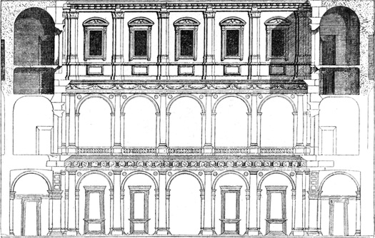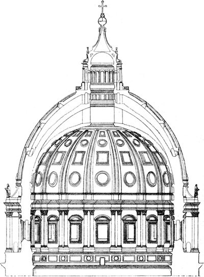 Nachdem Michelangelo auf die Ausübung von zwei Künsten verzichtet hatte, blieb ihm die dritte: die Baukunst. Hier konnte er alle seine Schaffensgedanken zu vollkommenem Ausdruck bringen, ohne seinem Körper Anstrengungen zuzumuten, denen derselbe nicht mehr gewachsen war; hier genügten Zeichnungen, und die Lust und Kraft zum Zeichnen behielt er fast bis zum letzten Lebenstage. Michelangelos Bauthätigkeit in Rom begann mit der Vollendung des Farnesischen Palastes, den Paul III, als er noch[S. 90] Kardinal war, durch Antonio da Sangallo hatte anfangen lassen, den er aber als Papst reicher und stattlicher, als ursprünglich geplant, zu gestalten beschloß. Auf Michelangelos Erfindung beruhen an diesem Palast, der einer der schönsten Roms ist, das prächtige Bekrönungsgesims der Außenseite und das oberste Stockwerk der Hofarchitektur (Abb. 74). Die Ausführung des Kranzgesimses nach Michelangelos Plan war die Folge eines vom Papst noch bei Lebzeiten des Sangallo ausgeschriebenen Wettbewerbs; den Ausbau des Hofes übernahm Michelangelo erst, nachdem Sangallo gestorben war (1546). Der Tod Sangallos hatte für ihn die wichtigere Folge, daß er an dessen Stelle als Leiter des Neubaues von St. Peter berufen wurde. Die Ernennung geschah durch eine Breve vom 1. Januar 1547, welches dem Meister die Vollmacht erteilte, daß er alle Pläne ändern und ganz nach Gutdünken bauen und niederreißen dürfe, und ihn zugleich den Verwaltern des Kirchenbaues gegenüber vollständig unabhängig machte, ihn sogar von jeder Verpflichtung einer Rechnungsablage entband. Nachdem Papst Paul III gestorben war (10. November 1549), bestätigte dessen Nachfolger Julius III (1550 bis 1555) alle jene Vollmachten. Die Ernennung Michelangelos lautete auf Lebenszeit, und durch den mehrmaligen Wechsel auf dem päpstlichen Thron, den er noch erlebte, blieb seine Stellung als Bauleiter des Petersdoms unberührt. Wohl fehlte es während der siebzehn Jahre von Michelangelos Thätigkeit an diesem Riesenbau niemals an Zank und Ärger. Mißgunst und Besserwissenwollen suchten dem Meister zu schaden. Viel mehr aber noch machten ihm die Bauverwalter zu schaffen, die, unwillig über die Verkürzung ihrer früheren Rechte und auch wohl unzufrieden mit der scharfen Beaufsichtigung, die hinsichtlich ihrer Ehrlichkeit stattfand, bald offen, bald heimlich mit immer neuen Angriffen gegen Michelangelo hervortraten. Mit unanfechtbarer Sieghaftigkeit wies der Meister alle Angriffe, welcher Art sie auch sein mochten, zurück. — Michelangelos Anteil an der endgültigen Gestalt der Peterskirche ist sehr bedeutend, wenn er auch selbst so bescheiden war, sich nur als den Ausführer der Pläne des Bramante, auf die er zurückkam, zu bezeichnen. Vor allem hat er den Ruhm, die Gestalt der Kuppel bestimmt zu haben. Schon gleich im Beginn seiner Thätigkeit als Baumeister von St. Peter beschäftigte er sich mit dem Gedanken an die stolze Kuppel, welche den Riesendom majestätisch bekrönen sollte. Die Kuppel des Doms seiner Heimatstadt schwebte ihm dabei vor Augen; deren Maße ließ er sich im Jahre 1547 schicken. Zehn Jahre später war der Bau so weit gediehen, daß der Aufbau der Kuppel beginnen sollte. Michelangelo machte eigenhändig ein Thonmodell zu derselben, und nach diesem wurde das große Holzmodell hergestellt, welches heute noch im Vatikan aufbewahrt wird und welches für die Ausführung im[S. 91] wesentlichen maßgebend geblieben ist (Abb. 75 und 76). Der alte Meister, der in den letzten Jahren, da ihm die Füße den Dienst versagten, auf einem Maultier auf den Bauplatz zu reiten pflegte, sah den senkrechten Teil des Kuppelgebäudes, die sogenannte Trommel, noch emporwachsen; aber es war ihm nicht mehr vergönnt, die gewaltige Rundung der Kuppel mit ihren unberechenbaren, ausschließlich vom künstlerischen Gefühl bestimmten Umrißlinien sich gegen den Himmel wölben zu sehen.