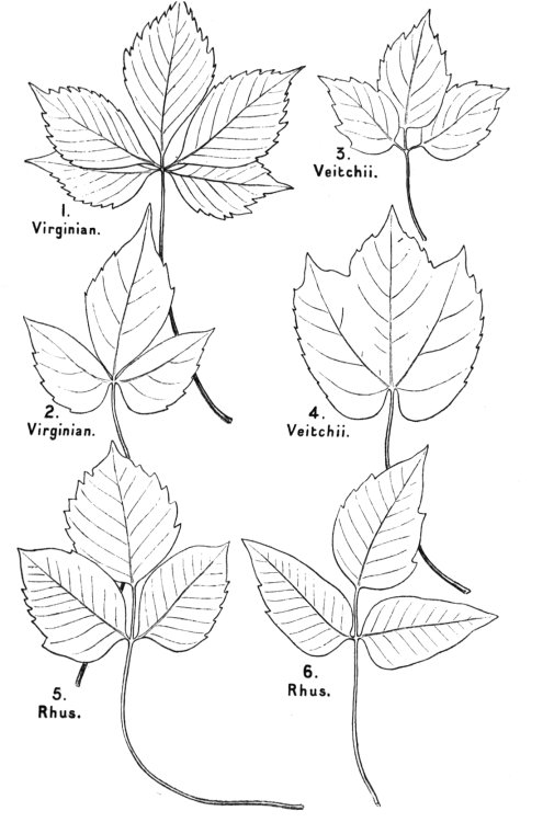 | 14. | Drawings of the Leaves of the Common Quinquefoliate Virginian Creeper, of the Adherent “Ampelopsis Veitchii,” and of the Poison-Vine (Rhus toxicodendron) | 95{x} |