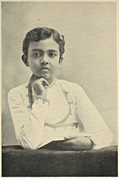 The childhood of an Indian girl of years ago may have some interest now, and I must say that I do not admire the modern upbringing of children. Our old system had many defects, but it had also many advantages, chiefly the ideas of simplicity and duty which were primarily inculcated in the little ones. Religion was never uninteresting to us and lessons were a pleasure. I was the second of ten children, and named after Sunity, the mother of Dhruba. I got up early and by nine o’clock my eldest brother, “Dada,” and I were ready for school. I went to Bethune College and he to a boys’ school. We came back at four. I had a second bath. My hair was arranged and I had a meal of fruit and sweets. Then came the glorious hour of fun and freedom when the innumerable children of “Sen’s House” played together.