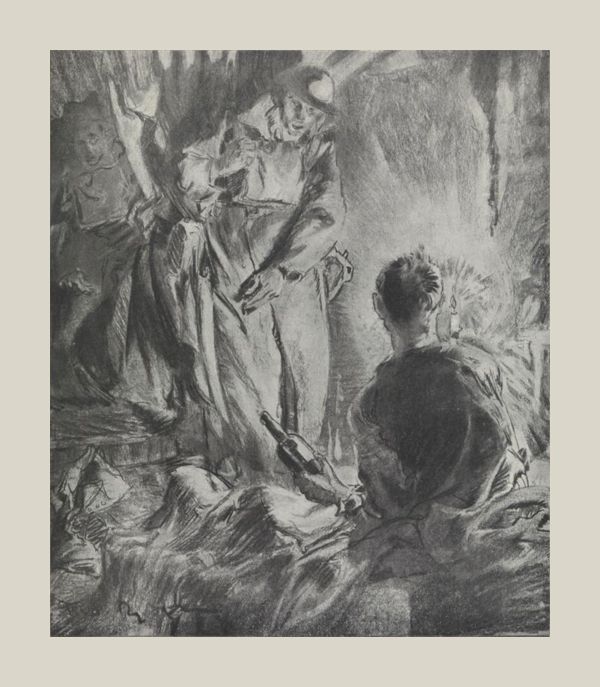 Being a satirist he is a humorist; but we must not look for mere lively notes of what may be called the humours of the trenches. Nothing can be more admirable in another aspect than those humours; or above all than the humour, and especially the good humour, which generally endures and records them. But such an artist is not concerned so much with that 10 comic relief, by which details arc relieved against tragedy, as with that high and tragic relief by which the tragedy itself is relieved against the light of heaven. Indeed there is something significant in all that white light and sharp shadow which belongs to such scenes, and is so favourable to the art of black and white. There is even something of allegory in that awful and empty daylight in which armies live, so often without a stick of roof or a rag of curtain. All the soldiers in a great war are historical characters; but these are rather specially standing, not against court or camp, but only against the sky. They are under a light which will indeed prove eternal; even as compared with other historic groups they will continue in a sort of permanent publicity; for we do not yet realise from what distant heights and terraces of time the arena of this war will be seen. And therefore it is, perhaps, that through all the rags and rude equipment that Dyson draws can be traced the lines of a sort of nakedness, like that of the dead on the Last Day.