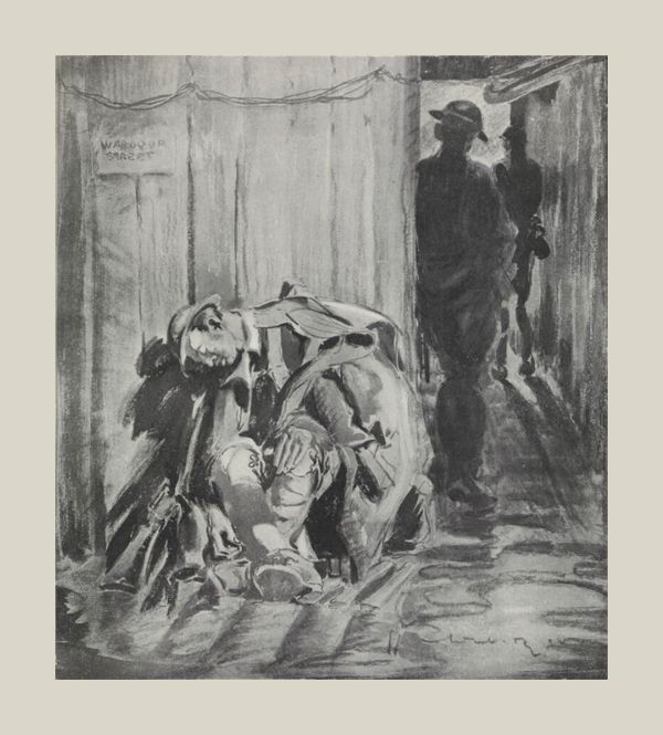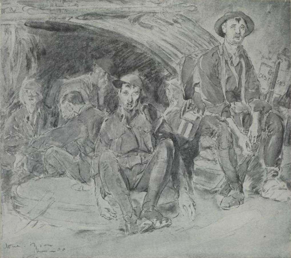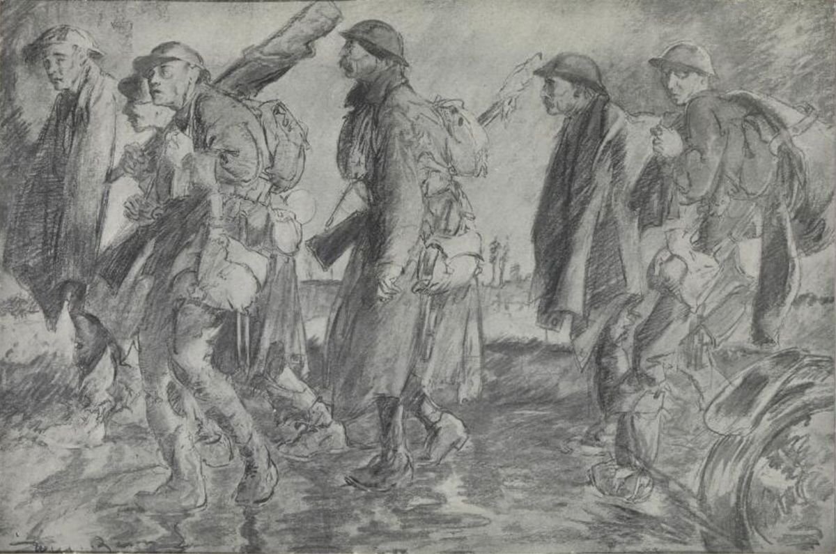 “. . . . the companies staging in the tunnels were resting in every conceivable attitude of weariness in slush that was everywhere, and everywhere rising higher. The circumstances were bearable to what they would be in the line, but fatigue even here, to the unlucky forced to spend a night in the bad spots of the tunnels, is a circumstance the aching misery of which cannot be judged by any standard with which our average civilian is conversant. Fatigue at its worst is to the most articulate of our generation the least familiar of humanity’s woes, but here in this world it is about us again with the torturing insistence of the troglodyte past—one of the commonplaces of the Stone Age with which war and the wonders of science have familiarised us. . . . The brutish weariness of our earliest hairy forbear, trembling in the savage morasses of an unfamiliar planet, is the daily lot of men like these—shopmen, men from the forge and factory and mine—heirs to all the amenities of the ages. It is part of the supremacy in suffering of the inarticulate infantry. Fatigue, actual brutish and insensate, is borne by them to a pitch at which mules might be heart-broken. Dull, undecorative heroism it is—that of these men of the ‘S——’.