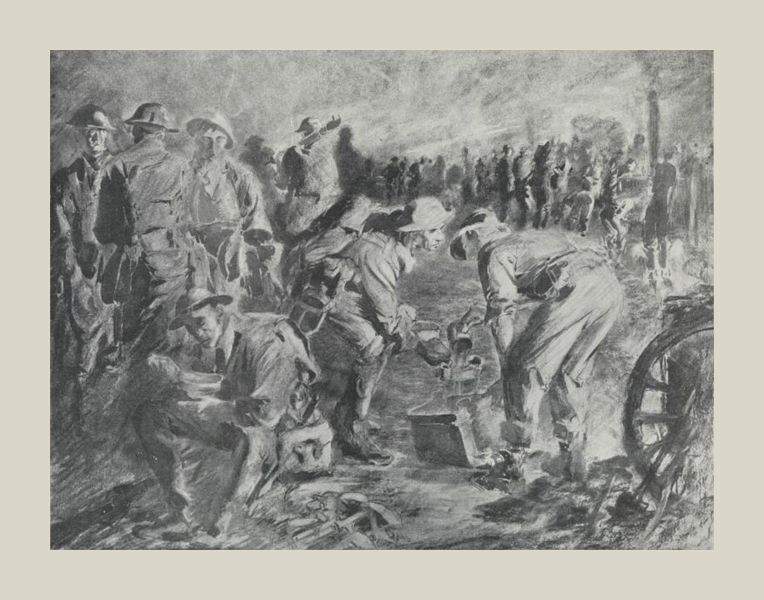 “Little groups of men burdened with the appliances of their trades file slowly across the hummocks of Flanders mud. They come out of endless holes and go into endless holes like lonely ants bent on some ant-like service. . . . . Ant-like in the distance, they loom upon a nearer vision things elemental and Homeric, big with destiny. They are merely soldiers at the base, perhaps shopmen at Brisbane, but they are things of mystery in the line. I feel that here all soldiers of all ranks tend to have the baffling profundity of the peasant, that sense of the nearness to the beginning of things which makes the artist see in the peasant the simple, unsolvable mystery of life reduced to its least common multiple—man shorn of all his vast cultures, which are not mysterious, and left simple man, which is.”