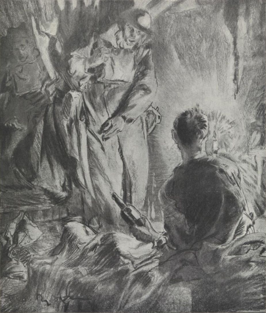 In any case the lightest, wildest or even crudest sketch scratched down by Dyson has always had more of the true grip of gravity than the whole of the Royal Academy. It is our modern misfortune that what is most solemn is most frivolous; because it is, in motive if not in method, most facile. There is always genuine thought in the design as well as the detail of Mr. Dyson’s work; and it is thought of a kind that is too little defined or understood. Where he has always differed from a common capable caricaturist is approximately in this; that it was never the comic but rather the serious feature that he caricatured. It is the soul rather than the body that he has drawn out in long fantastic lines. His comedy has never been merely comic, but rather philosophic and poetic. When he drew a Jew he did not merely draw the nose of a Jew, as a man might draw the trunk of an elephant; the most prominent thing about an elephant but not the most elephantine. He would rather draw that oriental type of eye, so strange in its shape and setting; which can be seen carved on colossal Assyrian masks of stone or painted flat on the cases of Egyptian mummies. And this marks his philosophic sentiment; he throws on things a new light which is also an ancient light; which is in its nature historic and even pre-historic. This is what links him up with the school of the great satirists; for it is one of the chief strokes of satire to tell new things that they are old; nay, in a sense to extinguish them by telling them they are eternal. But there is necessarily the same sort of epic symbolism underlying his treatment of the toils and perils he most sincerely admires, as underlying his treatment of the luxury and tyranny he has most drastically denounced or exposed. And that is why something of this almost allegoric spirit must be appreciated, in appreciating his studies of the appalling pageant of the great war.