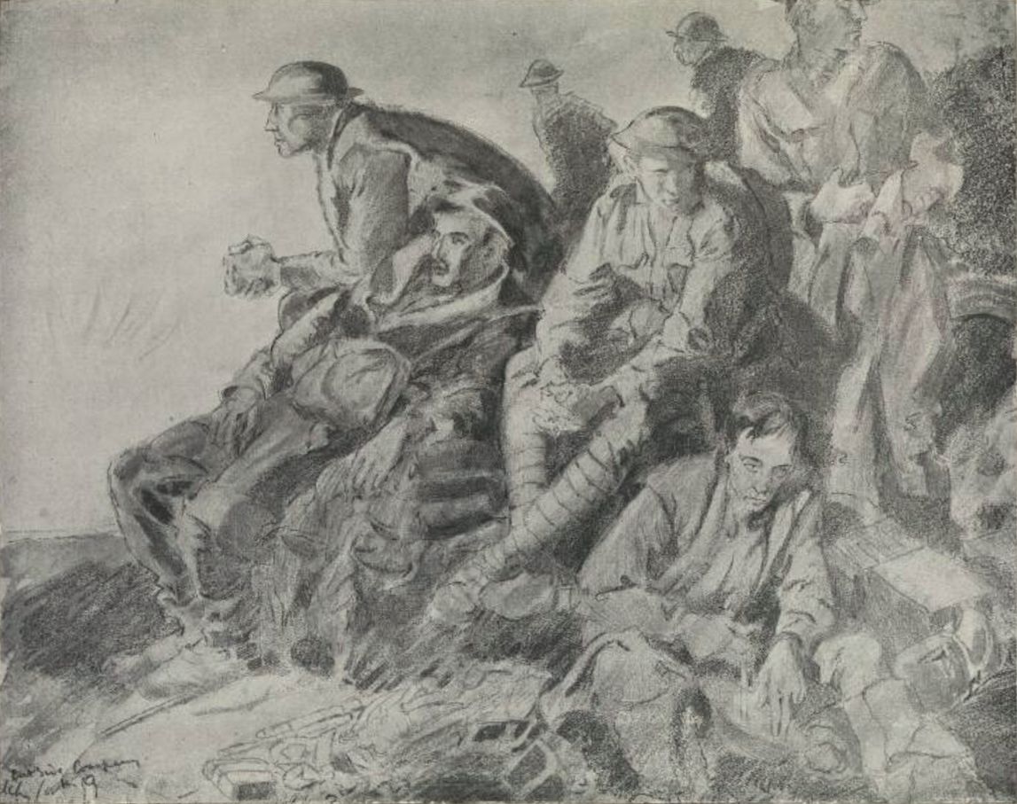 “One so often sees them—these seemingly purposeless groups, awaiting events with the grim immobility of Sioux braves . . . . doing nothing in places where no man would be for choice. Stretcher bearers they may be, or runners, or a company that has left the sickly foetid odours of the dug outs—reminiscent of fowl houses and tramps in summer—to make room for the relief, and is now standing by in all the taciturn boredom of that condition—silent men whom you pass, with all their taciturnity, with the feeling that they have passed a verdict on you annihilating in its justice. . . . .