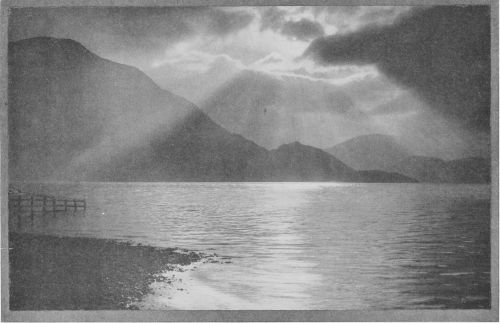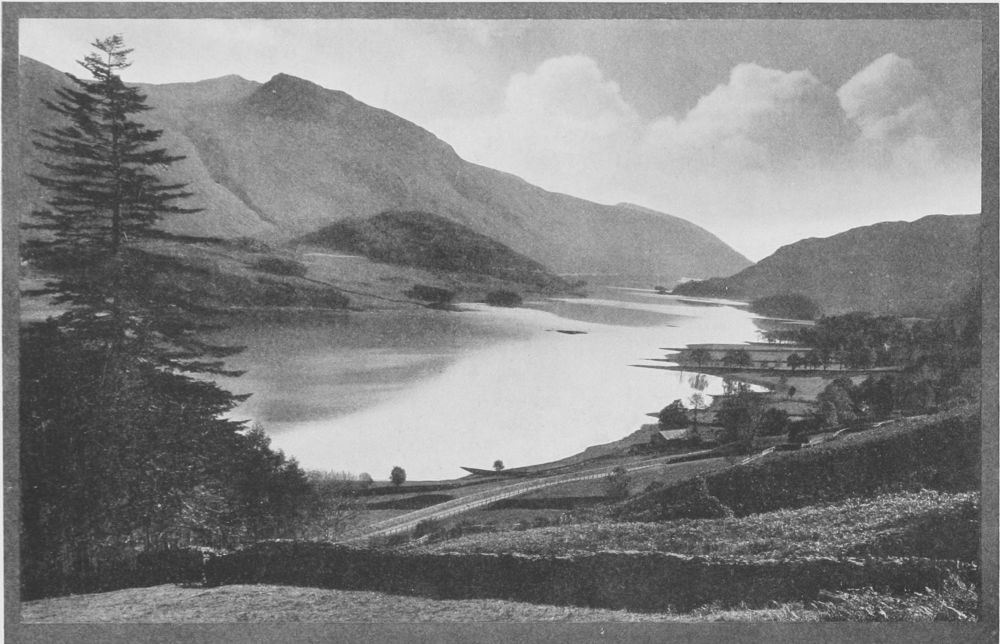 The iron skid is attached and our char-a-banc ploughs its way down the pass a few hundred yards, until suddenly the road in front of us seems to go almost perpendicularly over. Soon we are on the brink. The view downward, with the stream away below us in front and an unguarded precipice on our left, strikes terror into the hearts of nervous lady passengers; many of them prefer to alight and walk down this bit. Many of the gentlemen too, with lordly unconcern, express a desire to “stretch their legs” and they also get out and walk! The danger is only fancied, however, for thousands of char-a-bancs and other conveyances come over here every season and no accident, nor anything approaching an accident, has occurred—surely a tribute alike to the care and skill of the drivers, the excellence of their horses and the vigilance of the hotel proprietors, who see that all wheels, harness and other trappings are of the very best, and in perfect order. Thence the pass runs along the valley bottom, with Honister towering above on the one hand and the almost equally bare declivities of Yew Crag on the other—the wildest bit of coach road in the district—until, after passing through a gateway we come quite suddenly upon the gem of the “round,” Buttermere Lake itself. A small sheet of water as regards size, it is nevertheless very imposing. Set deep amongst mountains descending almost sheer into the lake and traversed by gloomy ghylls and water slides, bare of foliage except for a few localized larch and oak trees,{36} which seem to emphasise its quality of sombreness, Buttermere cannot fail to secure a lasting place amongst our memories of Lakeland. From the grand square shoulder of Honister Crag, now seen “end on,” with Great Gable peeping over its flank, followed by High Crags, the massive wedge of High Stile and the cone of Red Pike, to the distant form of Melbreak beyond Crummock Water, the mountain grouping leaves nothing to be desired—not even height or vastness; indeed, these qualities are quite features of Buttermere. Yet the lake is only a little over a mile long and the mountains less than three thousand feet above sea-level! Truly, form, proportion and atmosphere are wonderful deceivers.