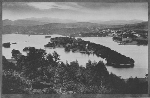 On our right the white walls of Storrs Hall gleam through the trees. It is now a hotel, but it will always be reminiscent of the historic occasion when Wordsworth, Southey and Christopher North foregathered here to welcome Sir Walter Scott and Canning to a yachting regatta held in honour of the “great Northern Minstrel.” Ere{14} long the islands claim our attention and then we touch at the Ferry, “one of the sweetest spots on Windermere.” The steam ferry-boat which plies all day long from shore to shore, carrying objects of all possible descriptions—pedestrian and otherwise—motor cars, carts and char-a-bancs, possesses an antiquity that renders it in keeping with the surroundings.