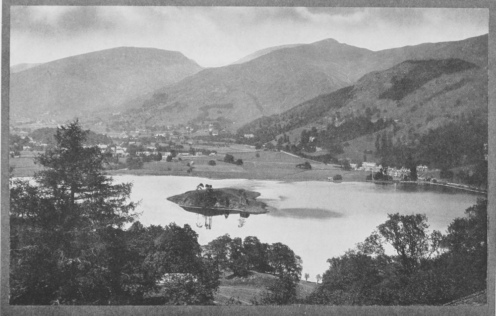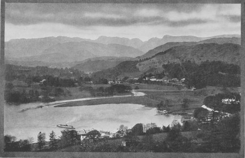 In the foreground is the Furness Railway Company’s steamer pier, whence passengers are landed for Ambleside, about one mile distant. The Langdale Pikes and Bowfell show to advantage in the background.