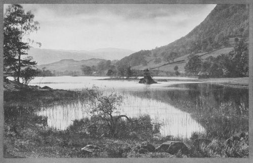 To the tourist who passes through on the main road in the day’s excursion, Grasmere and Rydal are beautiful—perhaps delectable is a better word—but to see them properly and rightly to appreciate them, it is necessary to stroll along the fellsides by which they are overlooked. At the northern end of Rydal a wooden bridge crosses the stream—Rothay Beck, which joins Grasmere and Rydal—and gives access to{20} a path known as Loughrigg Terrace. This was one of Wordsworth’s favourite walks, and as we follow along the breast of Loughrigg Fell and gaze down upon Grasmere, with its rich cordon of mountains and woods, we can easily realize the influences which chained a man of his temperament to this vale. Away at the far end of the lake is the little village with its square-towered church, in whose God’s Acre he is laid to rest. Beyond and above it is the gap in the mountains called Dunmail Raise, the entrance to Grasmere from the north. To the right of it rise the bare shoulders of Helvellyn and Seat Sandal; to the left Helm Crag—with its shattered rock summit—and further round the wildly secluded valley of Easedale, bounded by the wooded slopes of Silverhow. Truly a scene of singular charm!