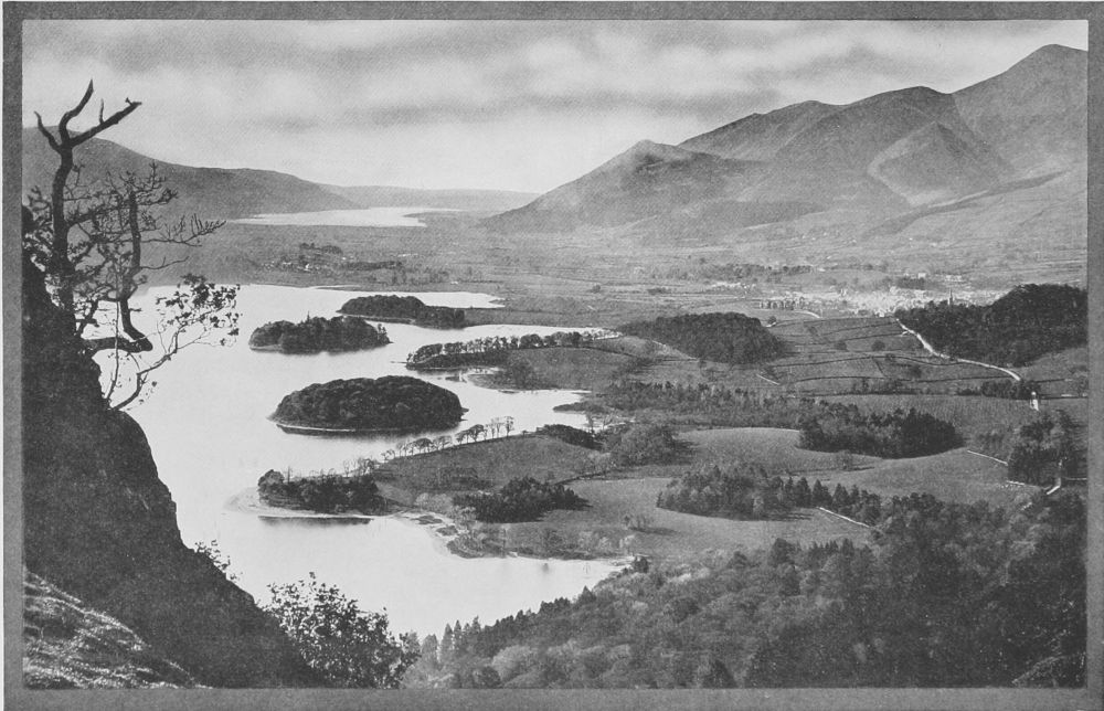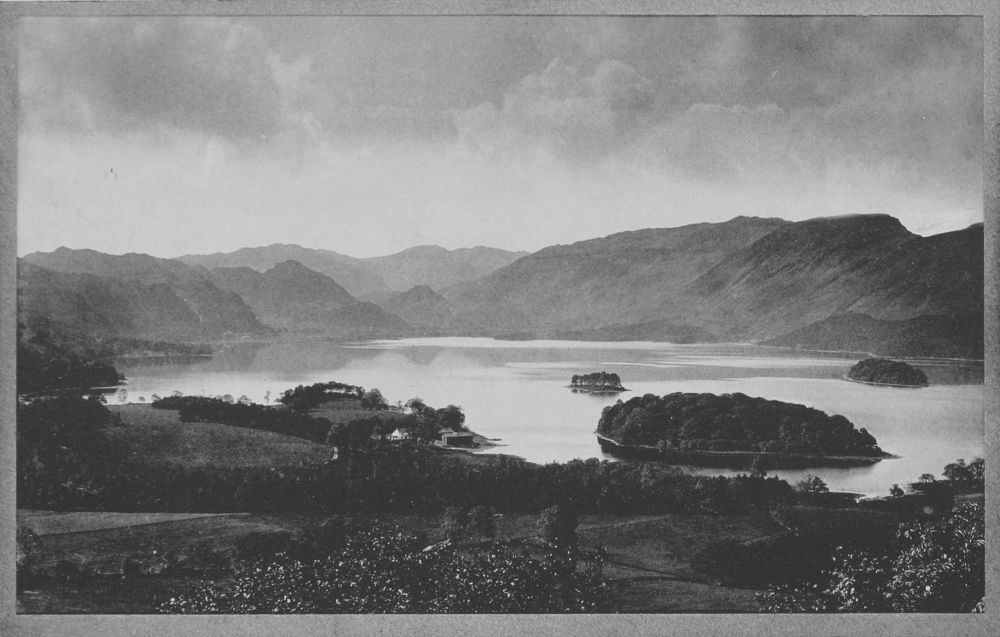 From Castle Hill, a quarter of an hour’s walk from Keswick. Borrowdale and Scawfell Pike are well seen in the middle background; the islands from left to right, are Rampsholme, Lord’s Isle, and St. Herbert’s Island.