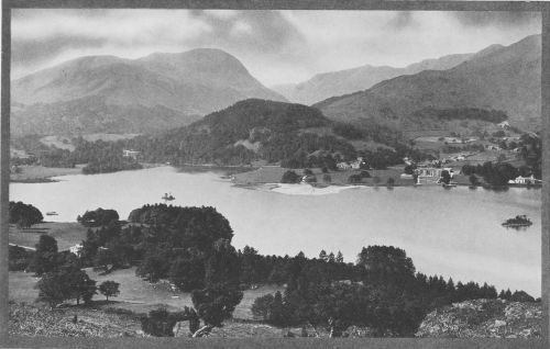 As we sail up from the foot of the lake there is ever present the feeling that we are working up to a climax, and this is attained when the top reach bursts on our view in a way that is quite dramatic and which exceeds our most sanguine expectations. The richly wooded slopes on our right descend to the water’s edge, whilst above they merge into the craggy fellsides, in many places overgrown by purple heather and golden bracken, with sombre Scotch firs interspersed in lavish style. Beyond this front array stretches the long, lean flank of Helvellyn, glimpses of which are caught away at the heads of all the side valleys. In front of us the fine sweep of St. Sunday’s Crag, one of the most perfect{40} outlines in the district, forms a centre-piece. Its beautiful curve sweeps gracefully down towards the Grisedale Valley, like a high-born lady acknowledging the existence of a humbler presence. Further round still is the deep valley of Kirkstone, bounded on the left again by the High Street range and its dependencies. Place Fell—variegated with masses of dark gorse and crag, but almost devoid of trees—fills in the scene on the left, an excellent foil to the luxuriance which is the dominant note of the opposite shore.