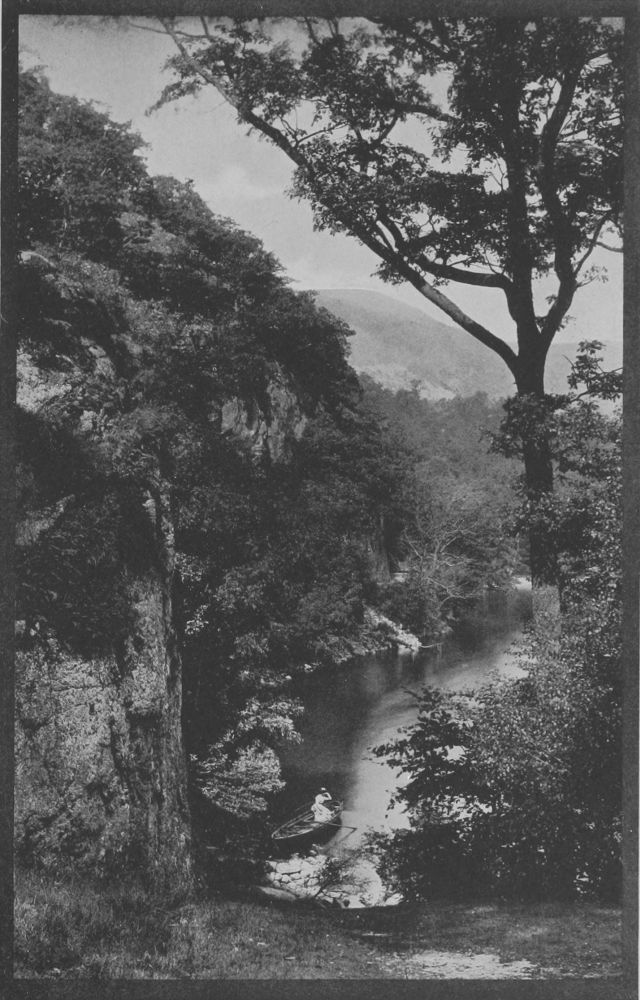 The drive from Ambleside along the banks of the Brathay, across Skelwith Bridge and thence over Oxenfell to Yewdale and down to Coniston, is typical of many of the day excursions in Lakeland—the changing scenes of beauty en route are so entrancing in themselves that even without a chief object in view, the drive is well worth taking. For whether it is the rich lichen-covered boulders over which the Brathay gently murmurs, the pastoral enclosures on its banks, with the old boundary walls climbing up the steep fellsides beyond, the feast of colour presented by the river and dark fir trees as we cross Skelwith Bridge, the wild moorland scenery of Oxenfell with that delicious glimpse across Colwith of the Langdale Pikes and Helvellyn, or the larch trees, heather and bracken slopes of Yewdale, interspersed with grey craggy patches, or whether, finally, it is Coniston Lake itself that most impresses us would be impossible to decide with any certainty.