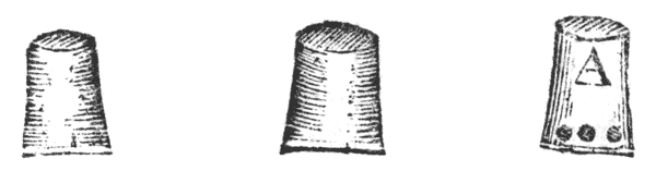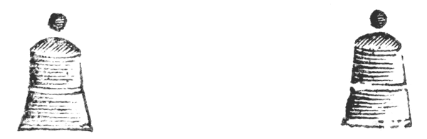 This feat is one of the greatest that the jugglers have done, and is inferior to none. To do this, you must go to some tinman, or any body that knows how to make your holes room enough for a die to go in and out, and then let them clap a good half-penny upon them all, and so make them fast, and nobody can tell them from real ones; then you must get a cap to cover your half-pence, a cap and a die for the company to fling to amuse them; when you are thus provided with half-pence, a cap, and a die, the manner of performance is thus: desire any body in the company to lend you seven half-pence, telling them that you will soon return them their own again; then say, gentlemen, this is made just fit for your money; then clapping your cap on, desire somebody in the company to fling that die to see what they can fling, and in so doing, take off the cap and convey your false money into the cap, so that the company may not see you put it in, then with your cap cover the die, so with your right-hand take up the true money, and put it into the left under the table, saying, Vada, begone, I command the die to be gone, and the money to come in the place; so take up the cap, and the die is gone, and the money is come, covering the money again with the cap, so taking the true money in your right-hand, and knocking under the table, making a jingling as though the money was coming through the table, then flinging then on the table, say, there is the money, and with your right-hand take off the cap, saying, and there is the die; so convey the false money into your lap, and there is the cap likewise. This is an ingenious feat if well handled, here make the figure of a die, and the fashion of seven half-pence, and a cap to cover them.