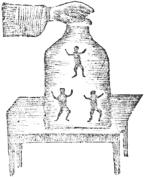 Take little figures of glass that are made hollow, of an inch and a half high, representing little boys, which may be had at the glass-blowers; these little images have a small hole in one of their legs, and are lighter than water; immerge them into the water contained in the glass A. B. this glass is about a foot or 15 inches high, and covered with a bladder which is tied fast over the top; a small quantity of air is to be left between the bladder and surface of the water; so, when you command them to walk down, press your hand hard upon the top, and they will immediately come down, and so you may make them dance in the middle of the glass, at your pleasure; and when you would have them to go up to the top, take your hand away, and they will walk up.