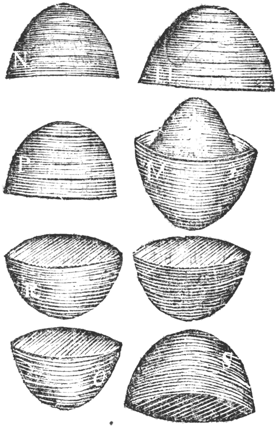 L, the out-shell of the globe taken off the figures; M, N, an inner shell; O, the cover of the same; P, the other inner shell; Q, the cover of the same; R, the third shell; S, that which covers it. These globes may be made with more or less varieties, according to the desire of the practitioner.