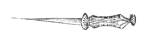 Take a bodkin so made as the haft being hollow, the blade thereof may slip thereinto as soon as you hold the point upward, seem to thrust it into your forehead, and so with a little spunge in your hand, you may bring out blood or wine, making the beholders think the blood or wine (whereof you may say you have drunk very much) runneth out of your forehead; then after shewing some countenance of pain and grief, pull away your hand suddenly, holding the point downward, and it will fall so out, as it will seem never to have been thrust into the haft, but immediately thrust that bodkin into your lap or pocket, and pull out another plain bodkin like the same, saying that conceit.