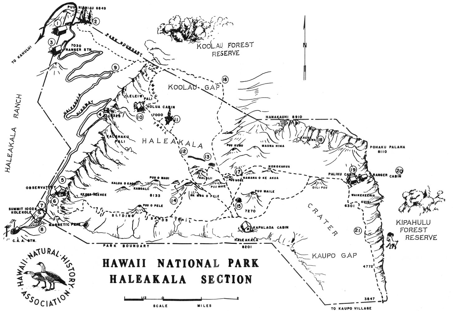 3. Headquarters of the Haleakala Section of Hawaii National Park: Stop at the Administration Building beside the road for information, permits, cabin keys needed on crater trips, and for assistance in case of trouble or accident. The park maintenance area is located behind the station. As you drive toward the summit, note the small native trees and shrubs growing along the road. This elfin forest was all but destroyed by goats and cattle; it has recovered under National Park protection. The book, “Plants of Hawaii National Park,” and the section on plants in this guide may help you identify the different species. These and other publications of the Hawaii Natural History Association may be purchased at the inn or at Park Headquarters.