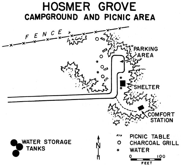A quarter mile above the park entrance, opposite the driveway to the inn, a paved lane, one-half mile long, leads to the Hosmer Grove Campground and Picnic Area. It has a shelter for rainy weather that contains two tables and two charcoal burners. Four additional tables with adjacent charcoal burners are in an open site below the road. Running water, parking space for eight cars, and sites for pitching tents are provided. Charcoal may be purchased at the inn. A self-guiding nature trail leads through the grove.