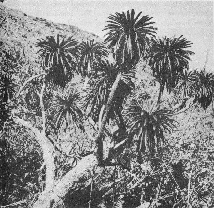 21. Kaupo Trail is a good trail that winds down Kaupo Gap, across little meadows, through groves of small AALII trees, and under 15 spreading KOA trees to the park boundary which is below the 4,000-foot contour. Wild goats may be heard on the pali or on the lavas in the gap. Kaupo Ranch extends below the park. From the redwood water tanks, a jeep trail descends through pastures to ranch headquarters. It is 8 miles from Paliku to ranch headquarters, which can be hiked in a half day. Kaupo Village on the belt road around Haleakala is 1½ miles further. The route is interesting, but arrangements must be made in advance to be met by car either at the ranch or the village. It is fifty miles from Central Maui by the shortest road. Although Kaupo Trail crosses private property, advance permission is not required to use it; but, in due consideration, please use care to close gates and do not molest or damage any property. The reverse trip from Kaupo Village into the crater is not recommended because of the long, arduous climb up the unsheltered, south-facing mountain slope.