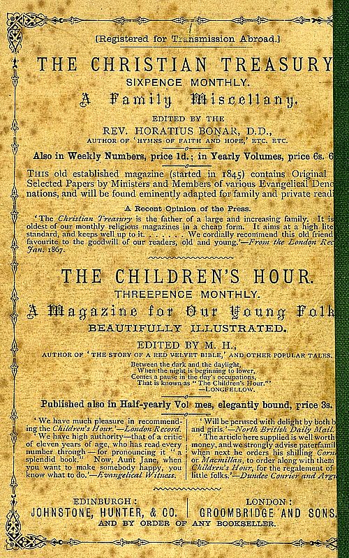 This old established magazine (started in 1845) contains Original and Selected Papers by Ministers and Members of various Evangelical Denominations, and will be found eminently adapted for family and private reading.
