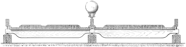 The Standard (Reiskey & Wolf Patent) Adjustable Alleys are constructed in every detail the same as the Standard Bowling Alleys except that the sleepers on which the beds rest are adjustable. The adjusting screws are placed at the ends of the sleepers and rest on the sills as shown above. They are riveted to Iron Shoes that are secured to the sills so that the screws can raise up or draw down the beds. Any deviations of the beds from level, except such as are due to wear, may be corrected by the adjusting screws, and the expense of re-planing avoided or reduced in cost. When it is necessary to plane out a worn spot the worn part may be raised by the screws and the necessity of taking a deep cut of the whole bed avoided.