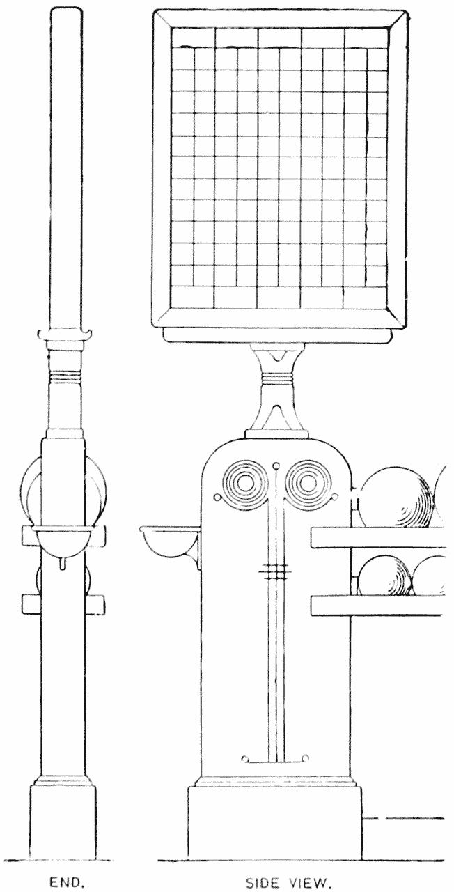WHEN desired we build High Runs and Newel Post as shown by the drawing on this page. As will be seen by the “end view,” this post is made thin to allow as much room as possible for the bowlers. This style of runway has a sift-out that delivers the small balls on a lower rack.