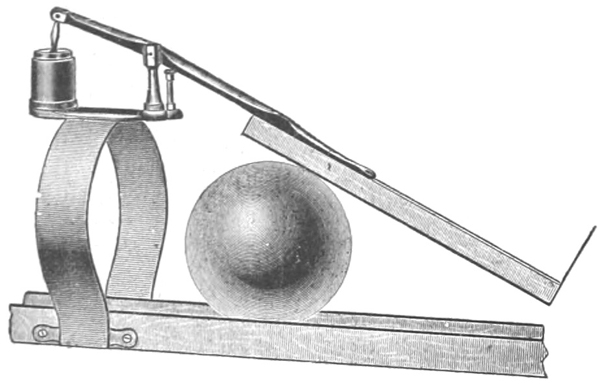 The retarder shown above was invented by a bowler and is perfection itself in operation. The resistance is greater for large and swift balls, and very little on slow or small balls. The resistance is affected by the air chamber under the short end of the lever which has an outlet for the compressed air controlled by a set screw so it can be adjusted. The long end of the lever has a wooden shoe with leather on the under side. A large ball raises this shoe high, compressing the air, a quick ball raises it quickly and is resisted by the compressed air which can only escape slowly. A small quick ball raises the shoe a short distance quickly and is held back by the shoe while a small slow ball passes under with scarcely any resistance.