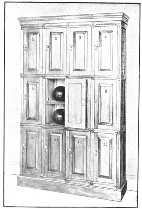 | Ball Lockers; 12 in a cabinet, each locker holding two Regulation Balls; locks on doors all different; net price for cabinet with oak front and ends | 30.00 |