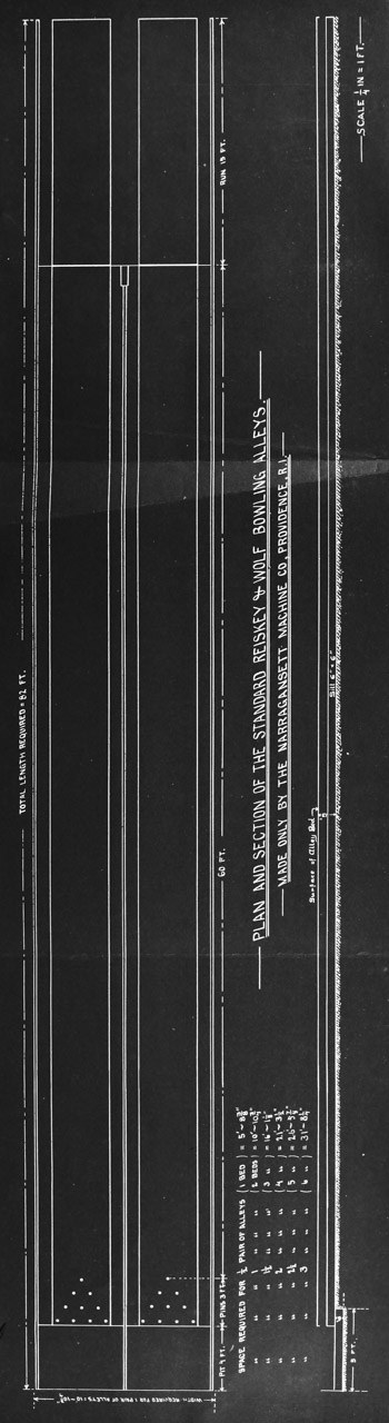 The necessary dimensions for “Regulation” Bowling Alleys are given on the blue print bound in opposite this page. The required space should be absolutely free from columns, piers, pipes, etc. Any such projection will prevent the alleys from being full “Regulation” size as required in match games. More space at the end of the “Run” for spectators is desirable, but not necessary. A space 5 ft. wide and 6 in. deep for the pit should be provided; the rest of the floor or ground should be level as shown in section on the blue print.