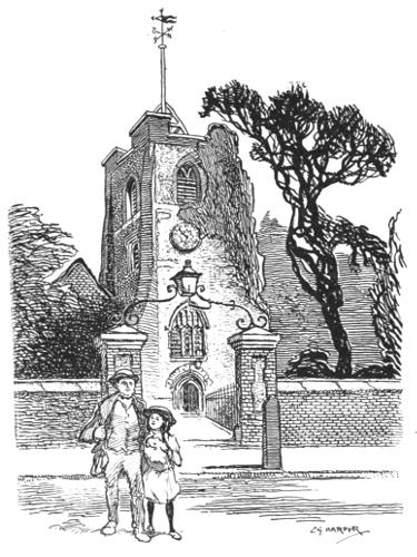 What remains of the old village of Chiswick lies considerably to the east of all these developments, and beside the river. There, past Hogarth House, where that famous painter lived and worked—now a museum and showplace at sixpence a head, in memory of him—stands old Chiswick church. Restorations and additions have left really very little of the original building, but it wears a very plausible appearance of age. The weather-vane exhibits a figure of St. Nicholas, to whom the church is dedicated, standing in a boat and holding a staff surmounted by a cross.