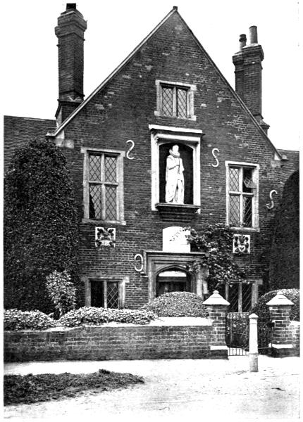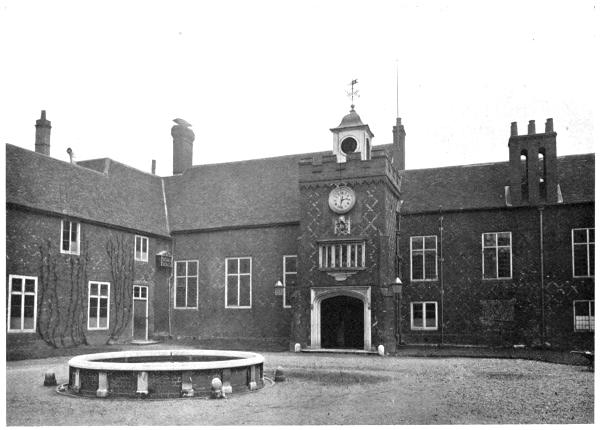 Fulham Palace does not look palatial, and its parts are very dissimilar. The two principal fronts of the roughly quadrangular mass of buildings face east and west. That to the east was built by Bishop Howley in 1815, and has the appearance of the usual modest country mansion of that period; while the west front, which is the oldest part of the Palace, and dates from 1502-1522, when the then dilapidated older buildings were cleared away, is equally typical of the less pretentious country-houses of the age. It was Bishop Fitzjames who rebuilt this side, and his approach gateway and the tower by which the Palace is generally entered, remain very much the same as he left them. A modest, reverend dignity of old red brick, patterned, after the olden way, with lozenges of black, pervades this courtyard, upon which the simply framed windows still look, unaltered. The sculptured stone arms under the clock upon the tower are those of Bishop Juxon, more than a century later than the date of these buildings, and have no connection[280] with the position given them here in modern times.
