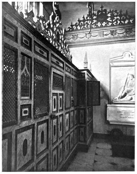 Lord Mordaunt was a younger son of the first Earl of Peterborough. Born in 1627, he was active among the younger Royalists, and figured at last in the restoration of Charles the Second, who created him Viscount Aviland, a title which seems to have been somewhat thrust into the background. He died of a fever in 1675, and appears to have led an active and an honourable life, which ought to have excused him from this posthumous grotesquery. The whole monument is indeed a prominent example[275] of the fantastic taste of its period, and is set about with marble pedestals bearing epitaph and family genealogy, and sculptured gauntlets and coronets.