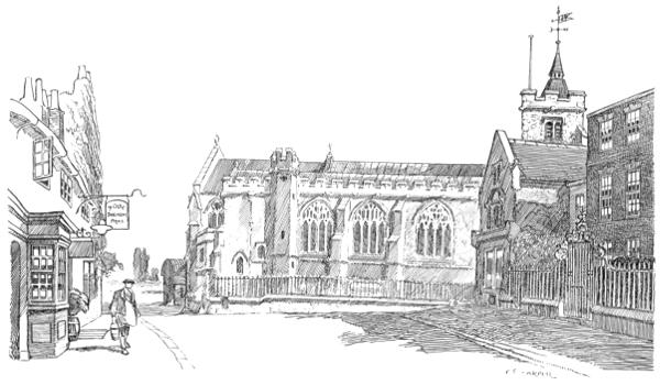 Fulham Church was rebuilt in 1881, and only the ancient tower of the former building remains. It is in the Perpendicular style of architecture, of a quite common type, and greatly resembles in general style that of Putney Church, at the other end of the bridge; but is on a much larger scale. It contains a peal of ten bells, of which the Fulham people used to be very proud, but an inordinate fondness for ringing them in crashing peals has destroyed any liking; and, in any case, Fulham of to-day, as a part of London, has lost that sense of individuality which used to take a proud interest in local possessions.