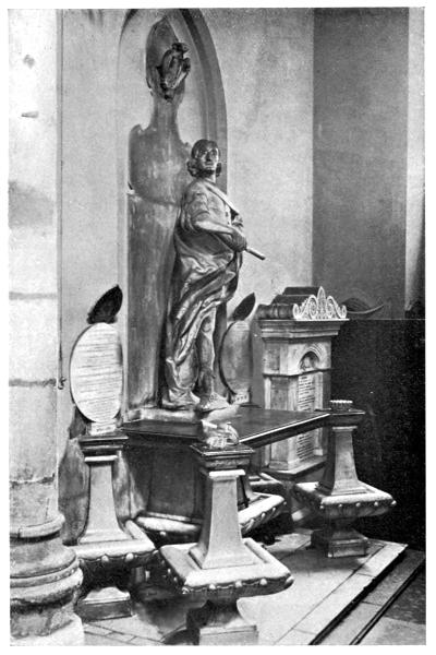 The interior of the church, which has weathered so greatly in the few years of its existence that it resembles an ancient building, is rich in monuments, but at one time possessed many more. The oldest is a lozenge-shaped Flemish brass dated 1529 to one Margaret Svanders, with a curious head-and-shoulders representation of the lady herself; but the oddest of all the memorials here is that to John, Viscount Mordaunt, including a statue of that nobleman, rather larger than life-size, in white[274] marble. It has now been banished to the tower, from the prominent position it formerly occupied in the south aisle, and is not a little startling, seen suddenly and unexpectedly in a half light. The weird-looking figure is like that of a lunatic policeman standing on a dining-room table in his socks, and pretending to direct the traffic, with a sheet wound partly round his nakedness, and something like a rolling-pin in his hand.