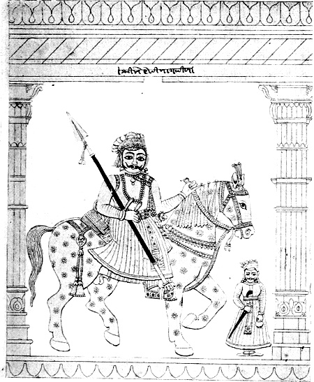 30. [The Mahārāvali palace, the top of which is 987 feet above sea-level, surmounts the main entrance of the fort, and is “an imposing pile crowned by a huge umbrella of metal, a solid emblem of dignity of which the Bhatti chiefs are justly proud; but the interior is ill-arranged, and space is frittered away in numberless small apartments” (Erskine iii. A. 38).]