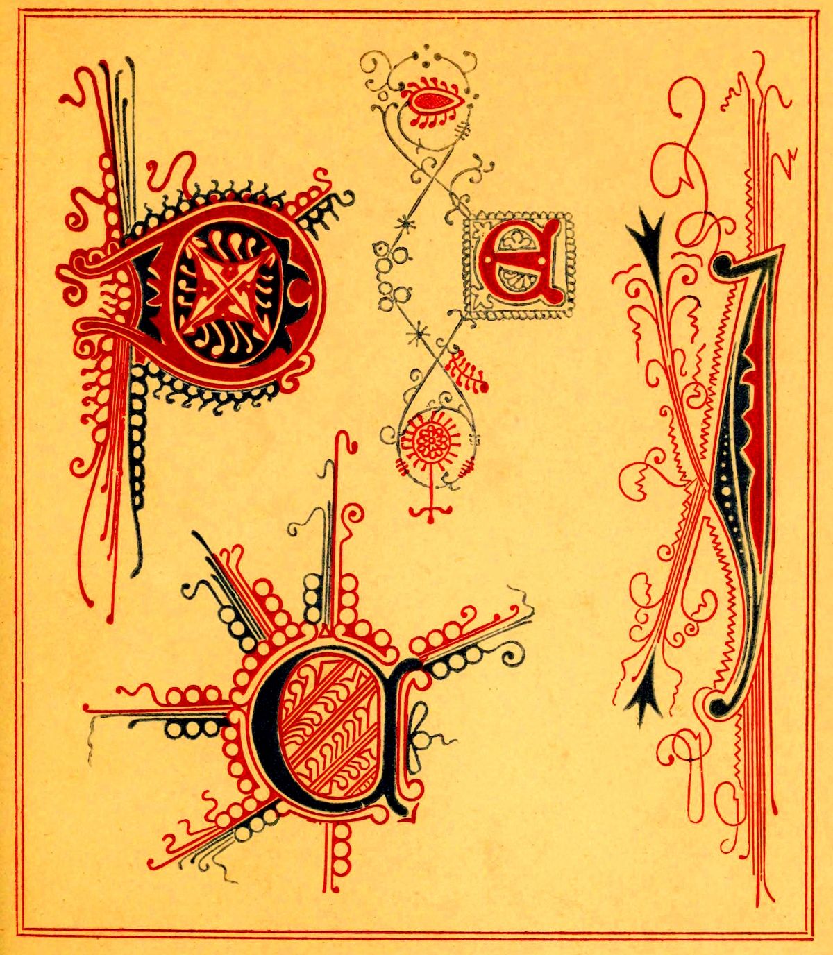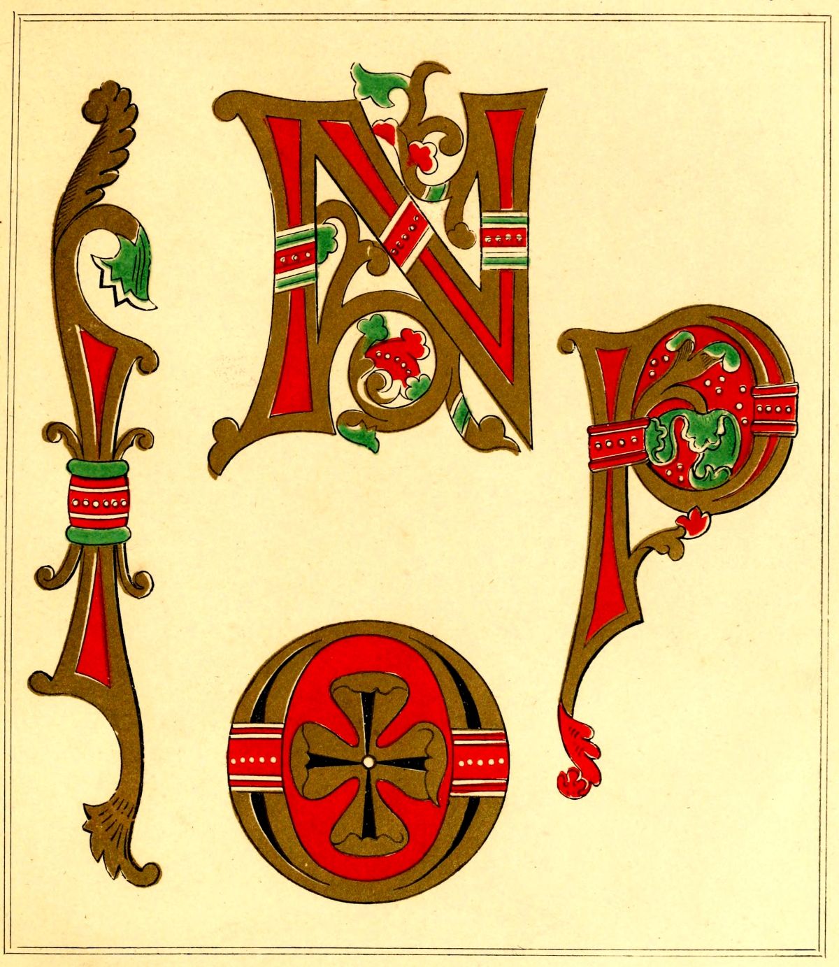 1st.—The component parts of the initial itself are made the subject of ornamentation; sometimes by the contortion of a dragon or some other pliable animal into a grotesque parody of the shape of the letter; sometimes by forming it of a combination of geometric figures, resulting from an endless crossing of lines, the whole terminating in heads or other parts of the same sort of creatures; sometimes by the introduction of foliage in a more or less integral manner.