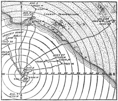 This meteorograph rose to a height of 23,870 meters (94,716 feet), at which height the pressure was 23 mm. (0.906 inches), temperature -52.1 C (-58 F.), relative humidity 21 per cent, wind E. (or more precisely S. 79 degrees E.), velocity 6.1 m.p.s. (14 miles per hour), but the minimum temperature was registered at 15,228 meters (49,960 feet) when the thermometer showed -64.7 C. (-85 F.), at which time the pressure was 89 mm. (3.504 inches of the barometer), relative humidity 19 per cent, wind N.W., 3.4 m.p.s. (8 miles per hour).