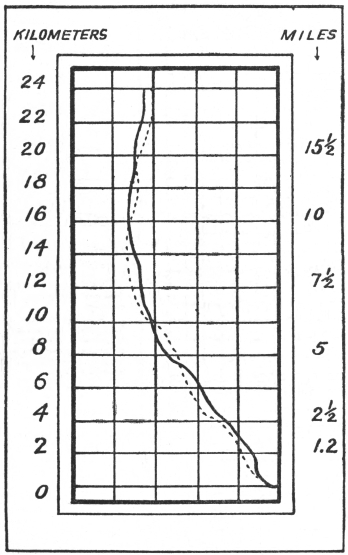 The Ascent.—The tractor was headed into a 30-mile northwesterly wind so that the “take-off” was quick and easy; there were only a few seconds spent rolling over the field, when the airplane left the ground and I felt the never to be forgotten cushioning feeling of the air. For ten seconds there was experienced a decidedly weakening nervous chill, which occurred to me once before when making a high dive from a spring-board. It was the sort of physiological disturbance that can only be counteracted by immediately pulling one’s self together saying, “Well, here goes nothing!” The momentary depression was immediately followed by a corresponding elation of feeling which strange to say did not leave me during the trip and is always associated with thoughts of the journey. There was no dizziness, although I am peculiarly susceptible to the least change in balance. The earth did not recede as we progressed steadily19 upward; we seemed part of the earth, but not of it. Although the airplane reached an altitude of 3,000 feet in a comparatively few minutes, the barometer falling from 30.0 to 27.0 inches, the decreased bodily pressure was not at all noticeable.H