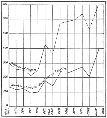 Results of a Year’s Work.—During the year 1915, the students of the aviation school made 3,652 flights with a total time aloft of 1,516 hours, and a mileage of 95,000. As regards weather conditions affecting flights, it will be found interesting to note Chart No. 5 giving number of flights and duration for the fourteen months ending August, 1916, which shows that work progressed regardless of10 weather, and at an increasing rate.D In February, a military tractor-seaplane (an all-California product), 125-horsepower motor, with twenty-six gallons of gasoline, four gallons of oil, and three passengers, making a total weight of 3,100 pounds, reached an altitude of 12,362 feet. This was the world’s record, the previous altitude under the same conditions having been 9,000 feet.
