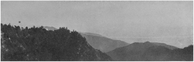 The photograph shows the location of the meteorological observatory(*) and the valleys below. From the elevation of the observatory (6,000 feet above sea-level), it is possible for the observer to determine the thickness and extent of fog as it is feasible to see as far southwesterly as Point Loma on a clear day, and southerly to Santa Catalina Island. Such observations and reports have been made and forwarded without interruption to date. They have proven of incalculable value to the aviators making cross-country flights.