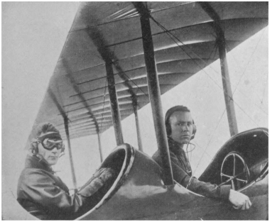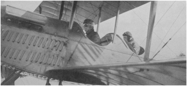 Next to the supporting quality of the atmosphere I had noticed the 70-mile blast of air as the airplane pushed its way steadily onward and upward. Naturally, the exhaust of the motor in addition to the roar of the wind made conversation impossible. Some airplanes have telephone communication between observer and pilot. (See Fig. 9.) During one flight in a machine not so equipped, the passenger noticed the breaking of some apparatus. Knowing that it was impossible to make himself heard he hastily scribbled the word “Accident!” on a bit of card, whereupon the pilot shut off his engine and glided to earth.