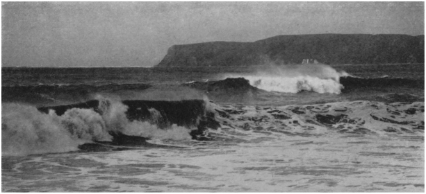 Two-thousand Feet above Point Loma.—Carrying out my suggestion as to investigating the “woolly,” the pilot drove the machine straight for Point Loma and those unseen aërial breakers. Suddenly there were two distinct “wallops” and I felt the fuselage beneath me respond as if struck by a stuffed club. There was evidently first a surge then a drop, and it was the descending current of air that deprived the airplane of the supporting medium, hence the shock. Point Loma itself, from this altitude, and seen directly from above, looked very like a barracuda’s backbone—long, low, and ugly. Although this peninsula (see Fig. 21) is less than 500 feet high it so effectively deflects the prevailing northwesterly wind that the upward surge has been noticed by aviators20 at an altitude of 4,000 feet. It is no wonder then that these descending winds, called “woollies” (from their churning the water into isolated masses which look like tufts of wool), are dreaded alike by yachtsmen and birdmen. They have been known to carry away topsails from too closely venturing schooners and student aviators always give the vicinity of Point Loma a wide berth.