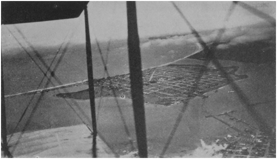 Part of Coronado and the portion of land called North Island, separated by Spanish Bight. Point Loma may be seen at the extreme upper right-hand corner of the photograph. The flying-machine sheds, buildings of the Aviation School, etc., may be seen in the immediate foreground. The U. S. Cavalry camp is the white splotch in the center foreground.