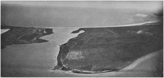 Location of the School.—Whatever the final action may be as to permanent location, it has been conceded8 by all authorities that the situation of the aviation school on North Island, San Diego Bay, is ideal. (See Fig. 21.) The so-called island is connected with the peninsula of Coronado by a narrow sand-spit, and it comprises many hundred acres of level land free from buildings and any sort of overhead wires. The island fronts the ocean on the south; Point Loma on the west with the narrow entrance to the bay between; to the north is the city of San Diego across the bay; and Coronado just beyond Spanish Bight on the east. This natural arrangement gives good air conditions for beginners, and also enables them to use the smooth waters of the bay as well as the rough ocean water for the seaplanes. The proximity of this location to San Diego is also a distinct advantage. (See Fig. 11.) All of the structures of the aviation school on North Island are temporary, the buildings consisting of a scattering array of huge sheds.