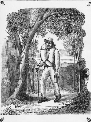 I started alone with swag, blankets, billy, pannikin, etc., in orthodox style, for a 200 miles' tramp through the bush. (See frontispiece.) This, however, was not much of an undertaking for me, as I was a great pedestrian, could do my six miles an hour easy, and often over 50 miles per day on my sketching tours in the "Old Country;" being tall (fully six feet), I had a good stride. At that time the Sydney Road was only formed a few miles out of Melbourne, and from the Rockey Waterholes to the foot of the Big Hill (commonly then called Pretty Sally's Hill) was swamp ground. I found a difficulty in getting over this; I had to tread the thistles down for miles to prevent bogging, and it was raining fast. The contractors were just forming the road, and on the first rise on the other side of the swamp the camp was formed. The men had knocked off on account of the rain. Just as I was level with the camp, I heard my name called out in true Irish accent, and out ran one of our shipmates to greet me. He occupied the next berth to us on board ship, and was ill a great part of the way. He had been a tradesman in Dublin. He was lively enough now, as he grasped my hand and cut a real Irish caper, with "Hurrah! for Australia and 14s. a day, and wood and water!" He was driving one of the contractor's drays. He wanted me to stay, as it was far into the afternoon, but no—my alloted mileage was not done, so I marched on.