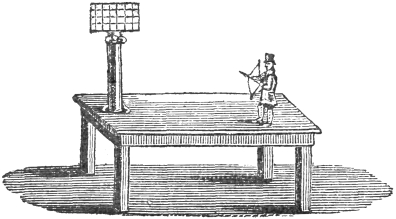 83 The board must be made of two planks, the longer and broader the better; there must be left, within half a yard of the end of each plank, half a hole, so as, both the planks being thrust together, there may remain two holes, like to the holes in a pair of stocks. There must be made likewise a hole in the cloth; a platter, also, must be set directly over or upon one of them, having a hole in the middle thereof, of the like size, and also a piece cut off the same as big as the neck, through which the head may be conveyed into the middle of the platter; and then, sitting or kneeling under the board, let the head only remain upon the board, in the frame. Then, to make the sight more dreadful, put a saucer, containing saffron, common salt, and spirits of wine, burning, before the head of the boy, who must gasp two or three times. The head will presently appear quite dead, if the boy set his countenance accordingly; and, if a little blood be sprinkled on his face, the sight will be the stranger and more horrible still.