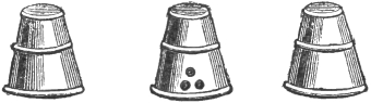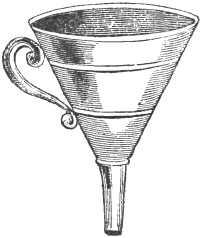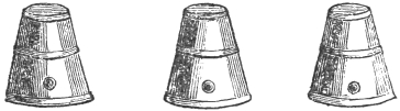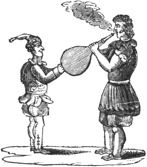 This pudding must be made of tin, consisting of twelve or thirteen little hoops, round, and in little ringlets, so that they may seem to fall one through another. It must have little holes made at the biggest end, that it may not hurt your mouth: hold this pudding, for so it is called, privately in your left hand, with the hole end uppermost, and with your right hand take a ball out of your pocket, and say, “If there is any old woman that is out of conceit with herself, because her neighbours deem her not so young as she would be thought, let her come to me, for this ball is a present remedy;” then seem to put the ball into your left hand, but let it slip into your lap, and clap the pudding into your mouth, which will74 be thought to be the ball that you showed them; then decline your head, and open your mouth, and the pudding will slip down at its full length, which, with your right hand, you may strike into your mouth again; doing this three or four times: then you may discharge it into your hand, and clap it into your pocket without any suspicion, by making three or four wry faces after it, as though it had stuck in your throat; and if you practise smiting easily on your throat, with your fist on each side, the pudding will seem to chink as if it was laying there; then say, “Thus they eat puddings in High Germany; they fling them down their throats before their teeth can take possession of them.