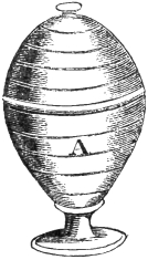 Explanation.—The egg is fastened to a thread by a pin, which is put in lengthways; and the hole, which has been made to introduce this pin, is stopped with white wax. The other end of the thread is fastened to the breast of the person who performs this trick, with a pin bent like a hook; the cane, passing under the thread, near to the egg, serves for it to rest on. When the music begins, the performer pushes the cane from left to right, or from right to left; it then appears as if the egg ran along the cane, which it does not, being fastened to its thread; its centre of gravity remains always at the same distance from the hook that holds76 it; it is the cane which, sliding along, presents its different points to the surface of the egg.